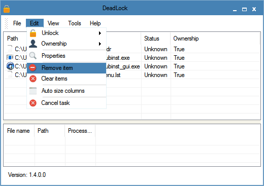 Soms lukt het niet om een bestand te verwijderen via Windows Verkenner. De toegang wordt geweigerd of je krijgt een andere foutmelding. Als je DeadLock achter de hand houdt, is het probleem snel opgelost. Gebruik de rechtermuisknop op het DeadLock-icoontje om het programma te starten met administrator-rechten. Gebruik Open / File(s) of Open / Folder en voeg bestanden (of een map) toe die je niet kunt verwijderen. In het menu Edit kun je aangeven welke acties je wilt toepassen. Verwijderen doe je met Remove. Gebruik Unlock als je alleen blokkades wilt opheffen. Met Ownership kun je rechten overnemen. Dit laatste is handig om bijvoorbeeld bestanden uit een oude back-up toegankelijk te maken. Deze truc kun je ook toepassen als je geen toegang krijgt tot bestanden op een externe schijf die er met een andere computer zijn opgezet.