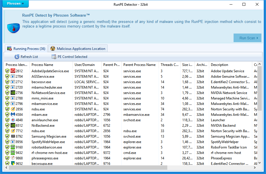 Heb je het vermoeden dat er iets niet in de haak is met je computer, maar kan je beveiligingssoftware niets vinden? Dan kun je RunPE Detector proberen. Het programma kijkt welke programma’s er actief zijn. Er wordt een lijst getoond. Hierin zie je om welk programma het gaat, waar ze geladen worden, de omschrijvingen, bestandslocaties en versienummers. Klik op Run scan om een controle uit te voeren op alle actieve programma’s. Er wordt gezocht naar eventuele aanpassingen die er niet horen te zijn. Als dit wel het geval is, verschijnen de verdachte processen in het tabblad Malicious applications location.