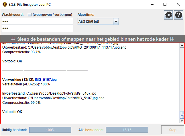 Er zijn veel oplossingen om bestanden te versleutelen met encryptie, waarvan de meeste nogal ingewikkeld zijn. Het programma S.S.E. File Encryptor heeft alleen een lastige naam, maar is zeer eenvoudig te gebruiken. Start het programma en geef twee keer een wachtwoord op. Sleep bestanden waarop je een wachtwoord wilt zetten via Windows Verkenner naar het S.S.E. File Encryptor-venster. De bestanden worden direct onleesbaar gemaakt. De originele bestanden blijven behouden, het programma maakt kopieën. Een bestand als foto.jpg krijgt na de ‘encryptiebehandeling’ de bestandsnaam foto.jpg.enc. Aan de toevoeging ‘enc’ zie je dat het bestand is beveiligd. Als je foto.jpg.enc opnieuw naar het S.S.E. File Encryptor-venster sleept, wordt het originele bestand opnieuw aangemaakt.