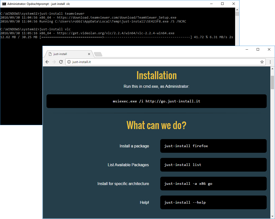Er zijn veel manieren om programma’s te installeren. Just-Install heeft een hoog ‘nerd’-gehalte omdat de installatie niet wordt gestart via een website, maar vanaf de opdrachtprompt. Allereerst moet je Just-Install op je systeem zetten. Ook dit gaat met een commando. Open een opdrachtprompt als administrator via Windows-toets+X. Geef de opdracht msiexec.exe /i http://go.just-install.it gevolgd door Enter. Dit is eenmalig. Vanaf nu kun je met speciale commando’s nieuwe programma’s installeren en updaten. Met de opdracht just-install teamviewer installeer je TeamViewer op je systeem. Met de toevoeging 7zip, dropbox, google-chrome en firefox installeer je de gelijknamige programma’s. Kijk op de website van de makers voor een volledig overzicht van alle programma’s die je met Just-Install kunt installeren. Ten tijde van schrijven waren dit er al meer dan honderdveertig. De opdracht just-install update werkt alle programma’s die je via Just-Install hebt geïnstalleerd bij naar de meest recente versie.