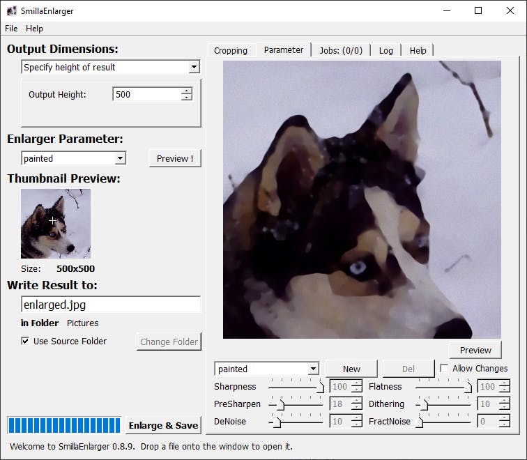 Bij SmillaEnlarger heb je dat wel. Niet alleen heeft de maker van dit programma zelf een aantal nieuwe technieken bedacht om afbeeldingen te vergroten, maar deze kun je ook nog eens helemaal naar je hand zetten. Bovendien kun je uit meerdere varianten kiezen en bijvoorbeeld van je vergroting meteen een soort schilderij maken.