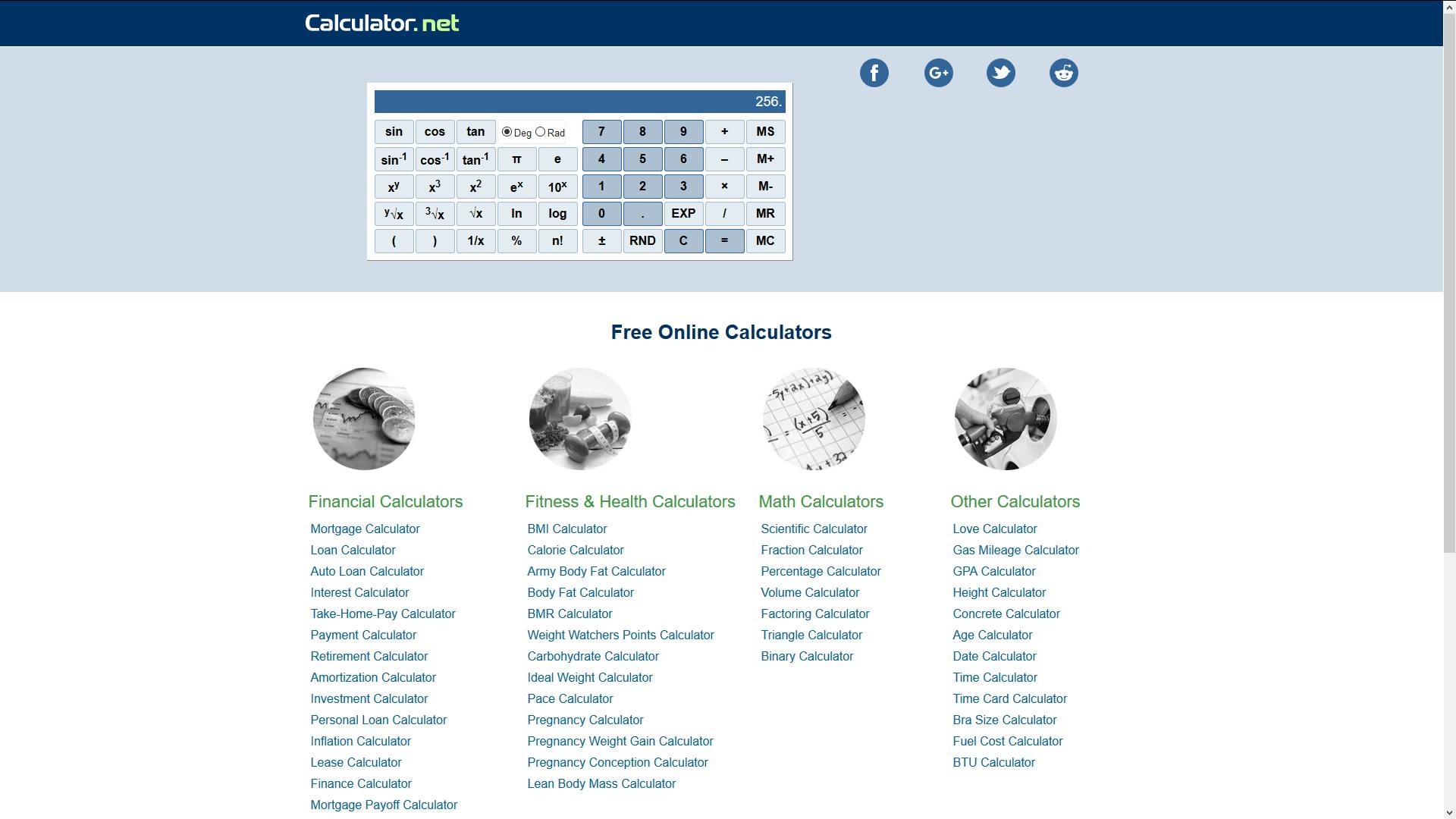 Inmiddels is natuurlijk ook de fysieke rekenmachine alweer achterhaald en hebben we appjes en programma’s voor dat doel of, nog makkelijker, een online-calculator. Nou ja, een… Op calculator.net vind je er zo’n tweehonderd, zowel voor algemeen als specialistisch rekenwerk. Zo zijn er op de site rekenmachines te vinden op financieel gebied (leningen, hypotheken, rente enzovoort), met betrekking tot gezondheid (BMI, lichaamsvet) en voor uiteenlopende zaken zoals data en tijden, brandstofverbruik en de cupmaat van bh’s. Zelfs voor het alledaagse wiskundige rekenwerk heb je volop keus, bijvoorbeeld met een wetenschappelijke rekenmachine, een calculator speciaal voor breuken, een exemplaar voor berekeningen met driehoeken en ga zo maar door.
