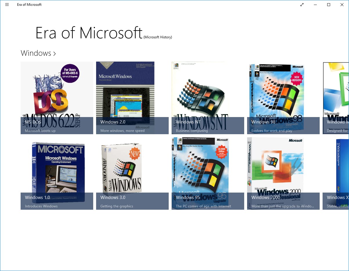 Wie benieuwd is naar de geschiedenis van de Microsoft-producten waar we nu zo aan gewend zijn, kan terecht in de app Era Of Microsoft. Deze app toont je de complete geschiedenis van al die bekende producten van de software- en later ook hardware-gigant uit Redmond, Washington. Zie hoe de eerste Windows-versies eruitzagen en hoe de systeemeisen steeds zwaarder werden. Bekijk de evolutie van Office en lees alles over Microsofts flirt met allerlei matig succesvolle hardware.