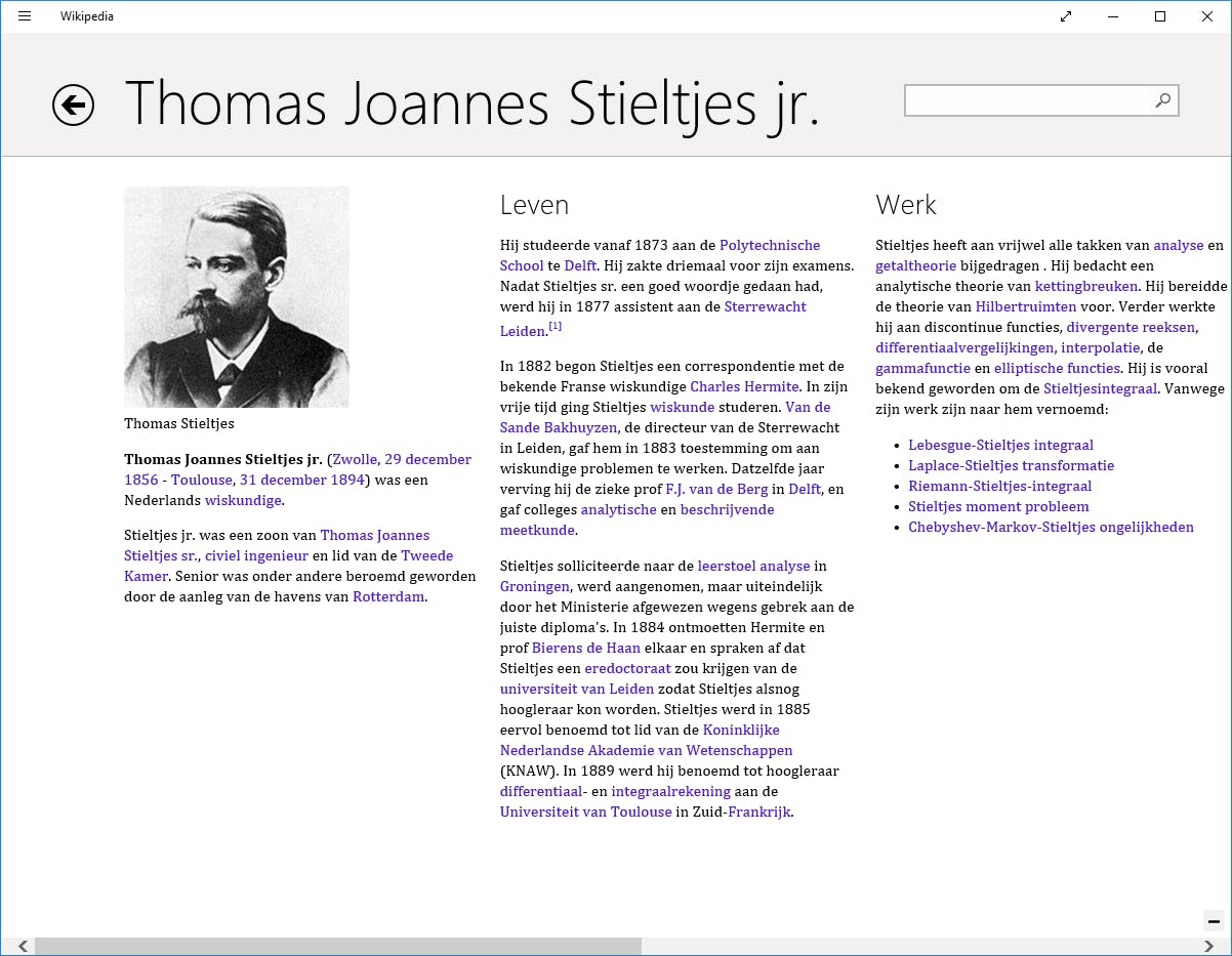 Wikipedia laat zich uiteraard prima lezen in de browser maar op mobiele apparaten krijg je dan vaak een kalere versie. Voor mobiele apparaten en desktop-pc’s is er de speciale Wikipedia-app. Het sterkste punt van dit programma is dat het de opmaak dusdanig aanpast dat het lijkt alsof je een ouderwetse papieren encyclopedie leest. Dat gebeurt uiteraard wel met de voordelen van de computer, dus infoboxen, tabellen en voetnoten – die afleiden van de lopende tekst – zijn standaard ingeklapt en kun je met een klik opvragen. Ook kun je afbeeldingen gemakkelijk vergroten. Met het app-menu schakel je moeiteloos over van Nederlands (standaard) naar een andere taal.