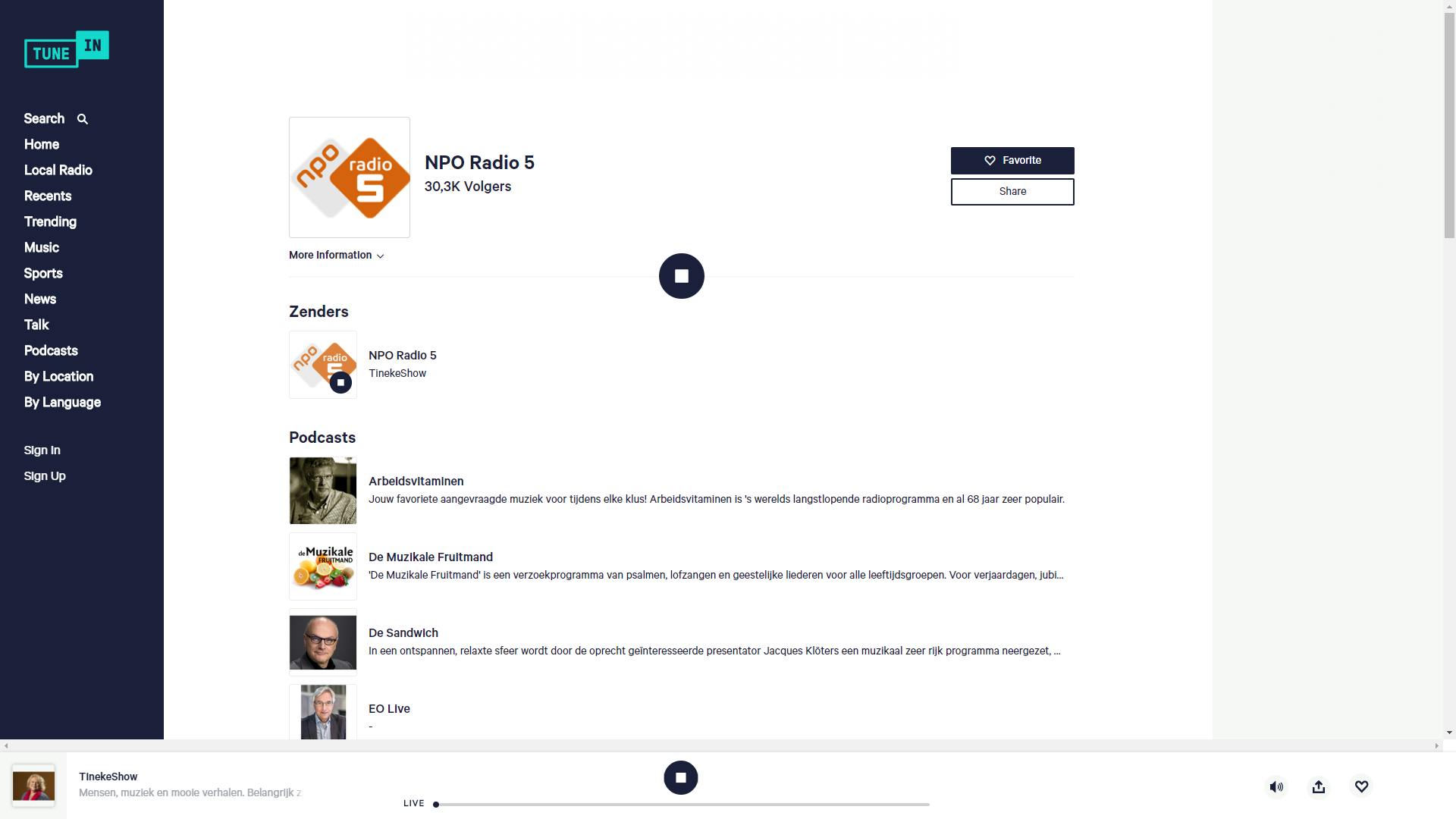 Programma’s en apps zijn natuurlijk prachtig maar wanneer je iets online kunt doen zonder software te downloaden is dat wel zo comfortabel. Zo zijn er heel wat toepassingen verkrijgbaar waarmee je radio kunt luisteren op pc’s of mobiele apparaten. Er gaat echter maar weinig boven www.tunein.com. Op deze site kun je luisteren naar een onvoorstelbare hoeveelheid radiozenders en podcasts van over de hele wereld. Deze kun je doorzoeken of doorbladeren op genre, locatie en taal. Uiteraard biedt dat al heel wat voordelen boven een gewoon radiotoestel maar dat is pas het begin. Hoor je muziek dan zie je meteen waar je naar luistert en kies je bijvoorbeeld een van de zenders van de NPO dan zie je meteen een lijst van podcasts die bij die zender horen én heb je toegang tot specifieke programma’s. TuneIn kent ook een betaalde variant waarmee je geheel reclamevrij kunt luisteren en waarin de liefhebbers van de populairste Amerikaanse sporten (honkbal, American football, ijshockey en basketbal) alle wedstrijden kunnen volgen.