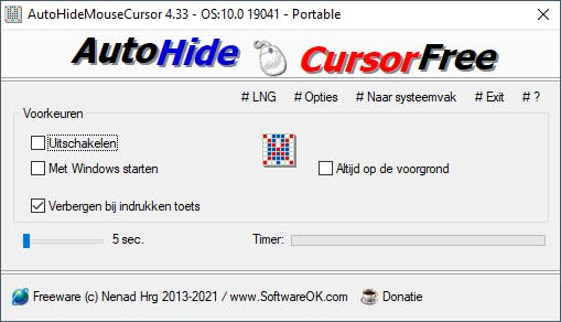 Programma’s om schermafdrukken te maken, bieden vaak de optie om de muiscursor wel of niet te laten zien. Maar de vele instellingen die Windows ons biedt voor ons favoriete knaagdier, voorzien niet in zo’n mogelijkheid. Da’s jammer, want een cursor die automatisch verdwijnt en pas weer opduikt wanneer je de muis beweegt, geeft een lekker schoon beeld. Gelukkig heb je deze mogelijkheid alsnog met AutoHideMouseCursor. Hiermee stel je simpelweg in na hoeveel seconden de cursor moet verdwijnen.