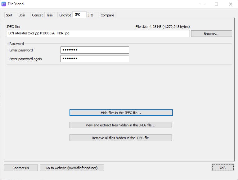Voor dat oorspronkelijke doel zul je dergelijke programma’s nog maar zelden tegenkomen, maar er zijn andere redenen te bedenken om zoiets te kunnen doen. Met FileFriend kan het, maar gelukkig kan dat programma nog wat andere kunstjes. Zo kun je bijvoorbeeld ook bestanden inhoudelijk vergelijken, bestanden en mappen versleutelen en bestanden of teksten verstoppen in een jpeg-afbeelding en ze er op basis van een wachtwoord ook weer uit tevoorschijn toveren.