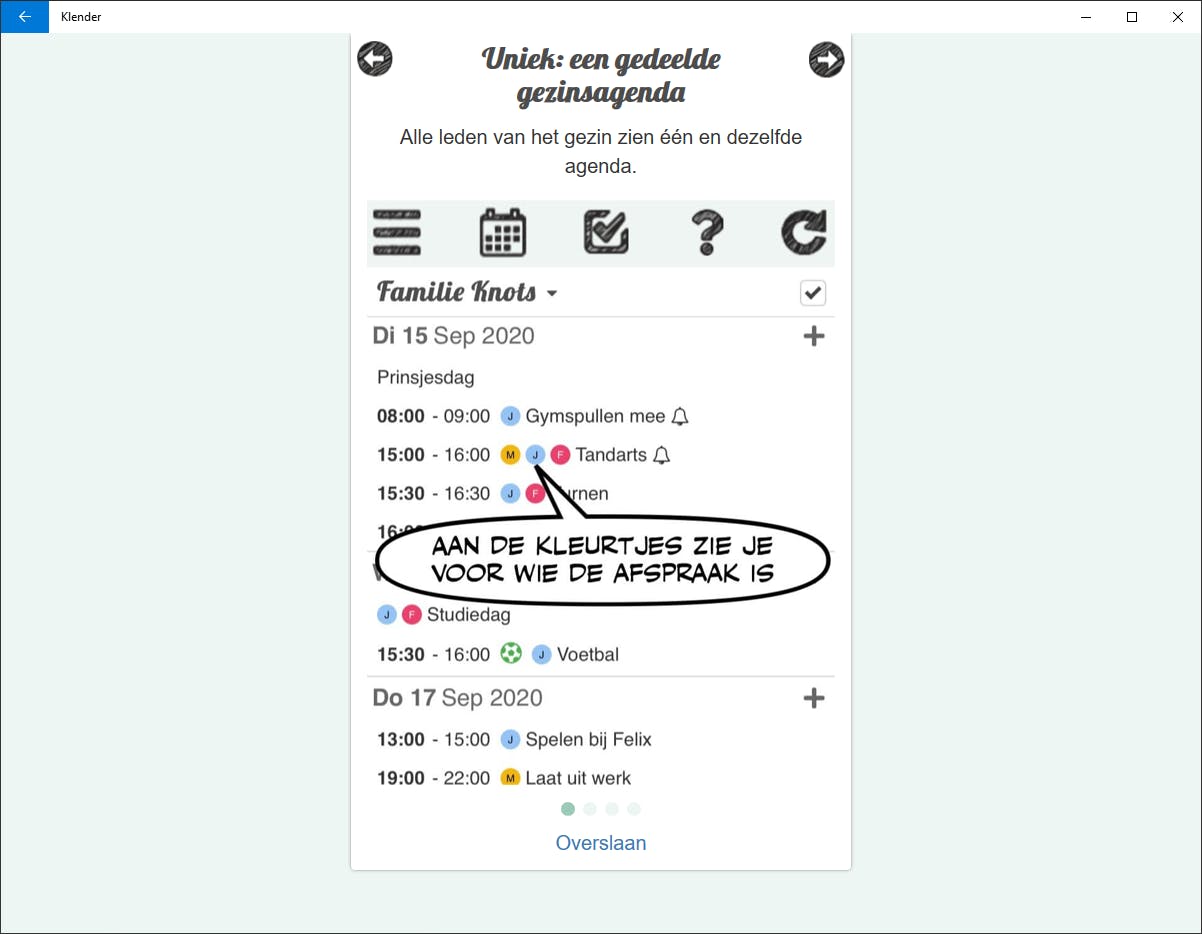 Hoe anders is dat met een gezin, en zeker een gezin met kinderen. Daar vraagt men zich voortdurend af wie waar hoe laat wordt verwacht, door welke ouder welk kind waarheen moet worden gebracht enzovoort. In zo’n situatie kan een moderne familie niet zonder groepsagenda en die vinden we in het gratis Klender, dat beschikbaar is in de Windows App Store en voor iOS en Android.