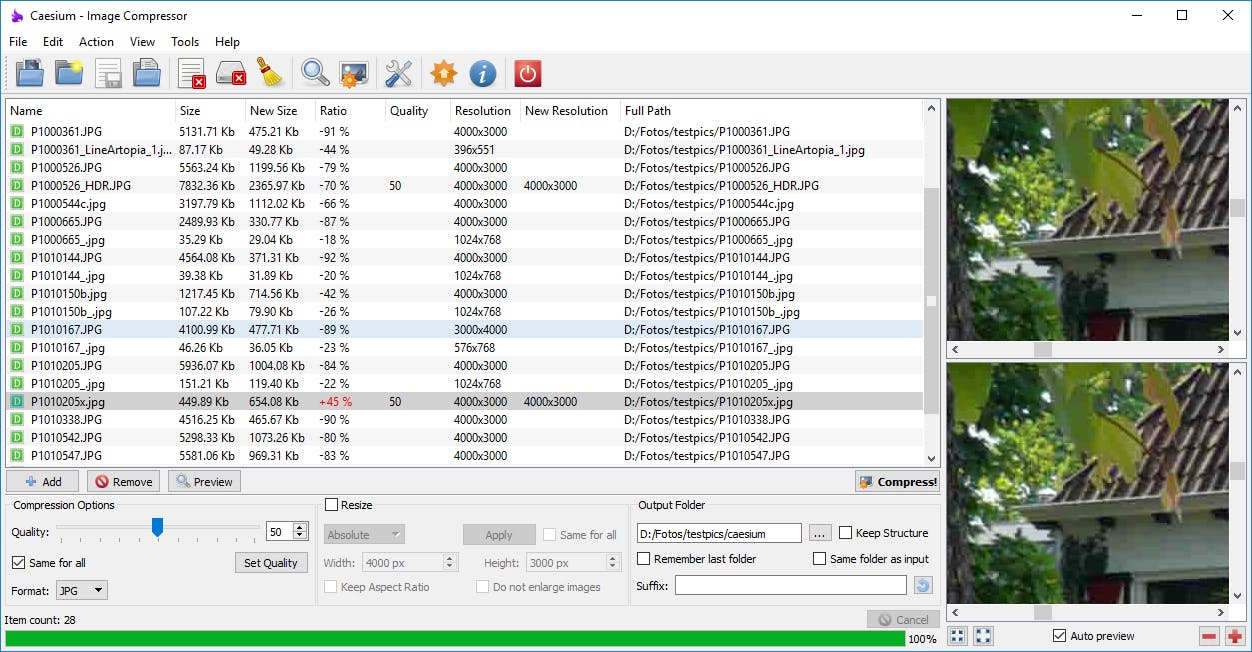De makers beloven dat het programma afbeeldingen in het algemeen beter comprimeert dan gebruikelijk is, en daar hebben ze zeker een punt. We lieten het los op een verzameling testbeelden en op een kwaliteitsinstelling van 50 procent haalden we gemiddeld zo’n 80 procent ruimtebesparing – handig voor wie (veel) foto’s wil delen.