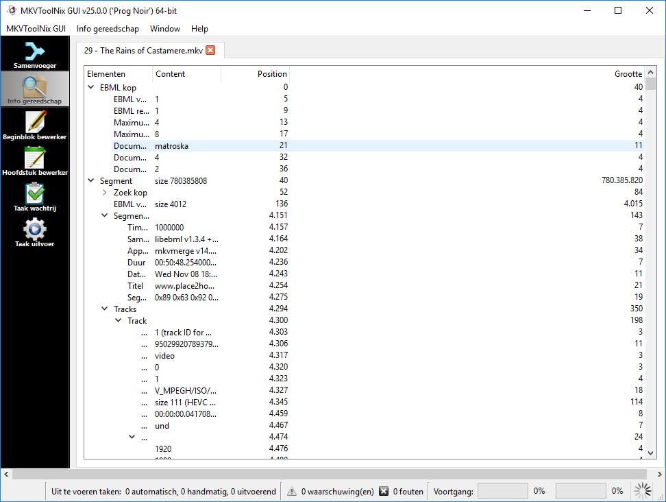 Natuurlijk kun je met een mkv-bestand meer dan het alleen bekijken. Zo zijn er omstandigheden denkbaar waarin je zo’n bestand wilt splitsen of er juist een aantal wilt samenvoegen. Net als dvd’s ondersteunt mkv het gebruik van hoofdstukken, en wellicht wil je die maken of bewerken. Of misschien wil je wel gewoon allerlei technische informatie over het bestand – iets dat Windows standaard niet prijsgeeft. Met MKVToolNix kan dat allemaal.
