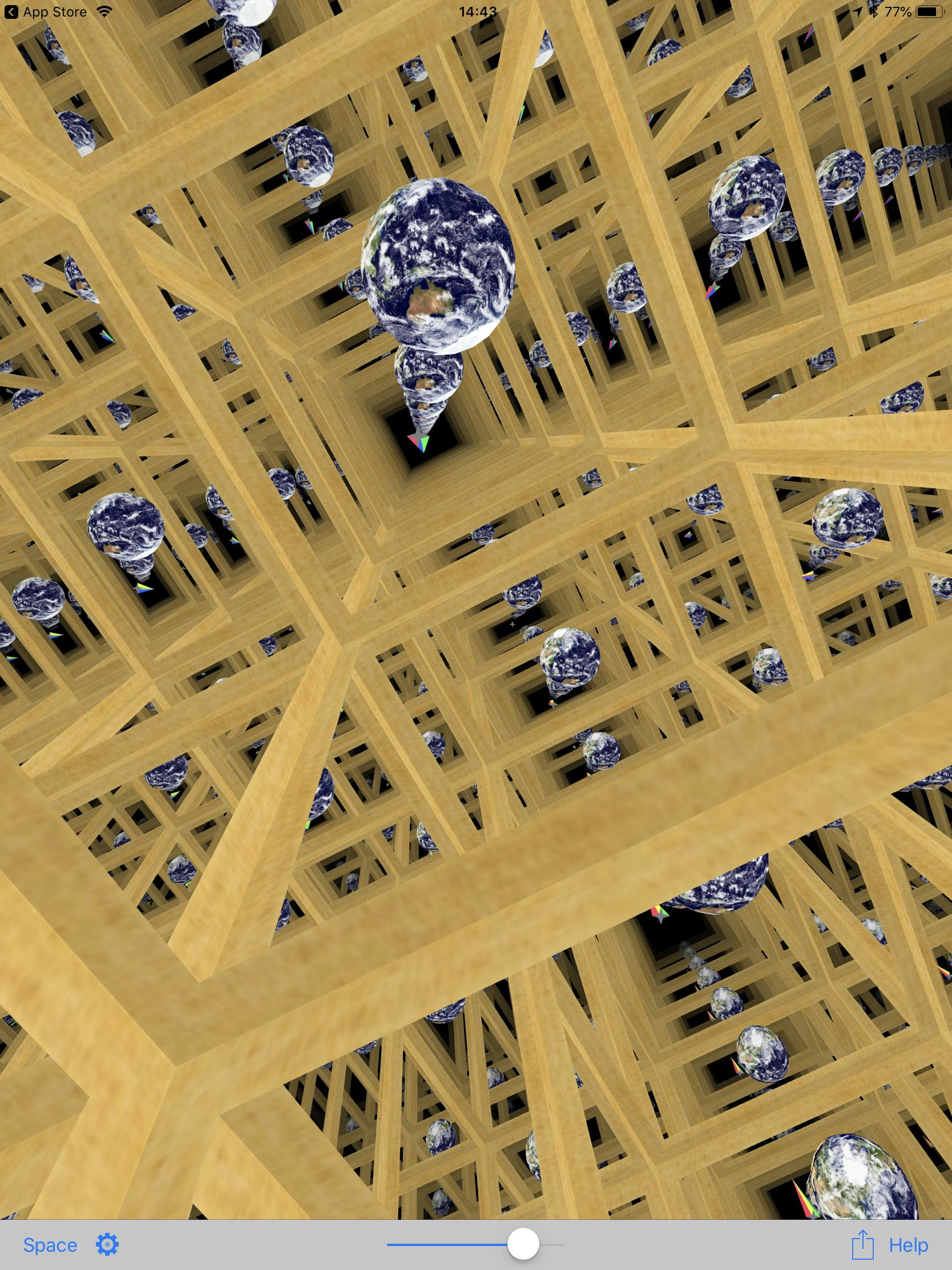 De aarde lijkt plat en er zijn – zeker in de VS – nog altijd heel wat mensen die geloven dat hij dat ook echt is. Het aardoppervlak is natuurlijk in een derde dimensie gekromd, maar is zelf wel tweedimensionaal. Je hebt immers aan twee coördinaten genoeg om elke plek aan te duiden. Zo zou het ook kunnen dat onze driedimensionale ruimte gekromd is. Over de afstanden die we met onze telescopen bestuderen zijn daar geen aanwijzingen voor, maar dat zegt weinig. Zo’n gekromde ruimte – die dus in zichzelf terugkeert – kan echter op allerlei manieren bestaan. De makers van de iOS-app Curved Spaces proberen al die manieren te visualiseren. Die mogelijkheid boden ze al langer in een gelijknamig pc-programma, maar met een iPad of iPhone kun je nu ook heel intuïtief door al die ruimtes vliegen om er een beeld van te krijgen. Voor iedereen die geïnteresseerd is in de kosmos is dat een duizelingwekkend leerzame ervaring.