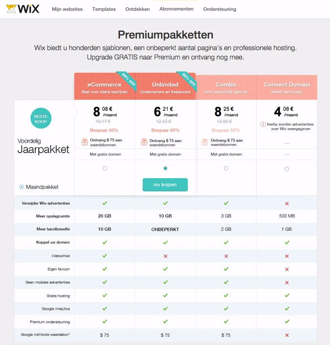 Met een gratis account kun je al heel veel mooie dingen maken in Wix. Wil je toch nog meer? Er bestaan Premium-pakketten met onder andere extra opslagruimte en bandbreedte. Zelfs statistieken, een eigen e-mailadres of webwinkelfunctionaliteiten zijn mogelijk. Prijzen variëren van zo'n 4 tot 16 euro per maand. Hier zie je alle tarieven en extra informatie.