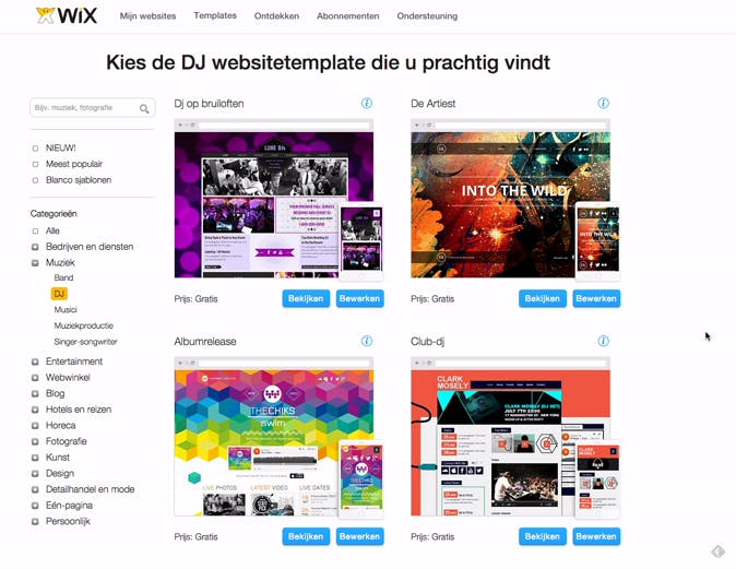 Helemaal bovenaan in de linkermarge zie je NIEUW!, Meest populair en Blanco sjablonen. Onder Categorieën kun je onder andere kiezen voor Muziek, Blog, Fotografie, Eén-pagina of Webwinkel. Bij elke thumbnail krijg je te zien of de template gratis is of dat ervoor betaald moet worden. Klik onder een sjabloon op Bekijken om een paginagrote voorvertoning te krijgen. Sluit het tabblad in de browser als je het maar niets vindt of ga verder met Website bewerken als je verder wilt met dit sjabloon.