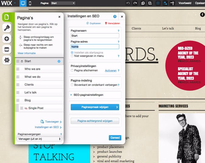 Zodra je in de bewerkmodus zit, is het belangrijk om eerst de structuur te bepalen. Hiermee bedoelen we onder andere het aantal pagina's en subpagina's. Klik bovenaan links op Pagina's om het menu uit te klappen. Afhankelijk van het sjabloon dat je gekozen hebt, krijg je hier 2, 3, 4 of 5 pagina's te zien. In dit scherm kun je heel eenvoudig pagina's van plaats veranderen of extra pagina's aanmaken via Toevoegen. Klik op het tandwieltje naast een pagina om de paginanaam of -adres te veranderen, de indeling te wijzigen, een pagina te verwijderen of te dupliceren enzovoort. Het aantal mogelijkheden is erg uitgebreid. Klik op Gereed om het venster te sluiten en klik daarna bovenaan in de donkergrijze balk op Oplaan.