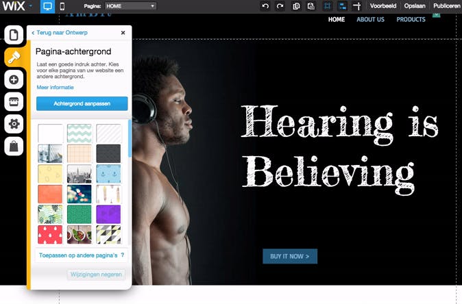 Via Ontwerp in de linkermarge kun je het uiterlijk van het sjabloon helemaal naar je hand zetten. Klik bijvoorbeeld op Achtergrond om een andere wallpaper in te stellen. Wix biedt standaard een heleboel achtergrondfoto's aan, maar je kunt uiteraard ook eigen beeldmateriaal gebruiken. Klik op Achtergrond aanpassen om een eigen foto te uploaden of schaalopties in te stellen. Wil je de gekozen achtergrond ook op andere webpagina's gebruiken? Dan volstaat het om onderaan op Toepassen op andere pagina's te klikken en de pagina's aan te vinken. Via Ontwerp / Kleuren kun je een ander kleurenpalet kiezen en het vervolgens eventueel nog aanpassen, en via Ontwerp / Lettertypen krijg je een overzicht van alle beschikbare lettertypes. De mogelijkheden zijn vrijwel eindeloos.