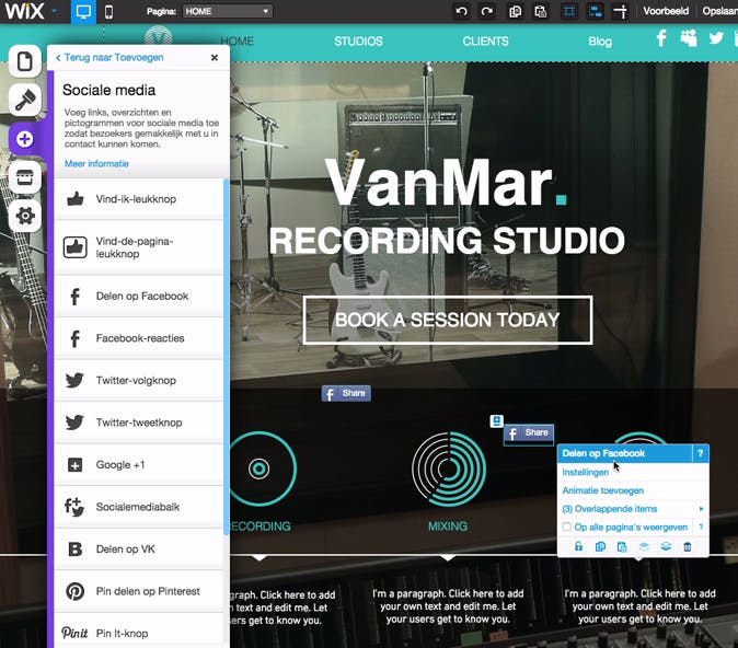 We hebben dan wel een sjabloon gekozen als beginpunt, dat betekent gelukkig niet dat we beperkt worden in het aanpassen van die standaardwebsite. Via de derde knop in de linkermarge, Toevoegen, kun je gebruikmaken van allerlei extra elementen. Bovenaan staan de gebruikelijke items die je ongetwijfeld nodig zult hebben: Tekst, Afbeelding en Galerij. Het lijstje elementen is echter heel uitgebreid. Wix laat je ook toe om snel en eenvoudig Vormen en lijnen, Knoppen en menu's of zelfs Sociale media toe te voegen. Wil je bijvoorbeeld een deelknop voor Facebook? Dan kies je Toevoegen / Sociale media / Delen op Facebook. Standaard krijg je dan een blauwe Share-knop maar je kunt de knoptekst desgewenst ook veranderen.