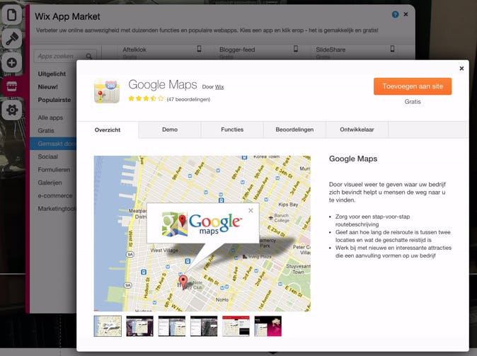 Een erg grote troef van Wix is dat je via de Wix-appmarkt heel veel populaire webapplicaties kunt toevoegen. Voor e-commerce-oplossingen en marketingtools heb je een premium-account nodig, maar het aantal gratis tooltjes is niet onaardig. Klik op Appmarkt in de linkermarge om een overzicht te krijgen van de applicaties die je kunt inschakelen. Op het tabblad Gratis vind je bijvoorbeeld tools om formulieren te integreren, een evenementenkalender toe te voegen, een kaartje van Goole Maps te gebruiken of een chat te implementeren. Het volstaat om je keuze te maken en op Toevoegen aan site te klikken.