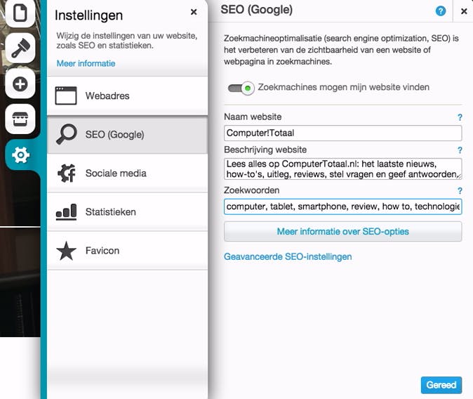 Via Wix kun je aan zoekoptimalisatie kunt doen, zodat je site eerder bij de zoekresultaten van Google terechtkomt. Kies Instellingen / SEO (Google) en zorg dat Zoekmachines mogen mijn website vinden ingeschakeld is. Geef daarna je website een naam. Dat is de kop die in Google getoond wordt. Bij Beschrijving website kun je een korte samenvatting geven. Ideaal is als deze 140 tot 160 tekens lang is. Ten slotte geef je bij Zoekwoorden een aantal specifieke zoektermen in. Zorg dat er komma's staan tussen de verschillende zoekwoorden. Wie meer kaas heeft gegeten van SEO kan via Geavanceerde instellingen nog metatags toevoegen. Klik op Gereed als je klaar bent met deze instellingen.