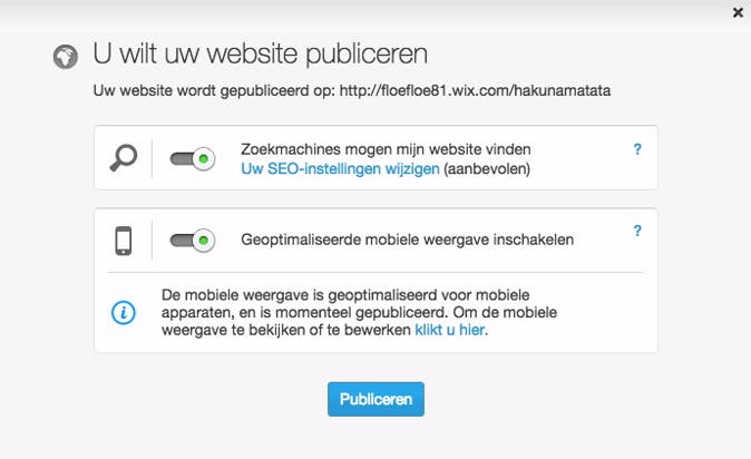 Klaar? Helemaal tevreden met het resultaat? Klik dan bovenaan in de balk nog eens op Opslaan en controleer alles goed via Voorbeeld. Via de knop met de smartphone bovenaan in de balk kun je ook zien hoe je website er op een smartphone uit zal zien. Ga vervolgens uit de previewmodus met Terug naar bewerken. Voer eventueel nog wat aanpassingen door en klik vervolgens op Publiceren. Standaard staat Geoptimaliseerde mobiele weergave inschalen aan en we adviseren om dat zo te laten staan. Klik onderaan op de blauwe Publiceren-knop om je website echt online te zetten.