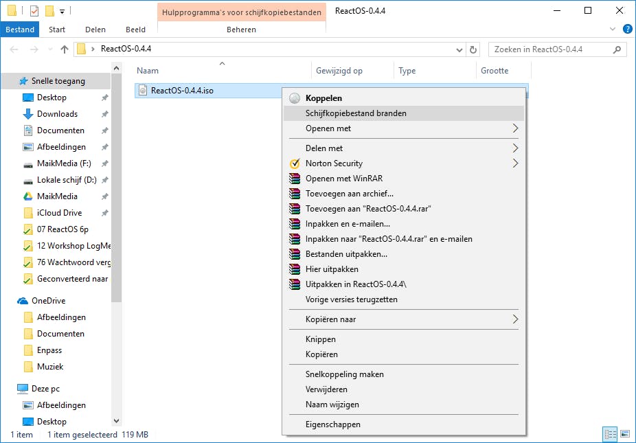 De meeste besturingssystemen kun je vanaf een usb-stick, cd of dvd installeren. De makers adviseren om voor ReactOS geen usb-stick te gebruiken, omdat de usb-ondersteuning nog niet optimaal is. Je installeert dit besturingssysteem om die reden het beste vanaf een optische schijf. Doe alvast een lege cd of dvd in de computer waarmee je dadelijk de installatieschijf gaat branden. Surf vervolgens naar www.reactos.org/download en klik op Download BootCD. De beheerders van ReactOS vragen om een vrijwillige donatie. Zie je daar vanaf, dan sla je via No, thanks. Let’s proceed with the download! deze stap over. Bewaar het zip-bestand op je huidige pc. Je gebruikt het contextmenu onder de rechtermuisknop om het zip-archief uit te pakken. Je hoeft het iso-image alleen nog maar op de schijf te branden. Dat kan met elk willekeurig brandprogramma. Onder Windows klik je met de rechtermuisknop op het iso-bestand, waarna je kiest voor Schijfkopiebestand branden / Branden.