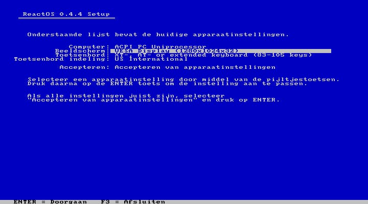 Het is nu tijd om de installatie van ReactOS uit te voeren. Kies in het blauwe scherm voor Dutch (Netherlands) om de standaardtaal voor het besturingssysteem in te stellen. Druk tweemaal op Enter. Er verschijnt netjes een waarschuwing dat het besturingssysteem nog in een vroege ontwikkelingsfase verkeert, zodat mogelijk niet alle functies correct werken. Druk wederom op Enter. Er komen nu enkele instellingen tevoorschijn. Je past hier bijvoorbeeld de resolutie van het scherm en de toetsenbordindeling aan. Als je besluit om iets te wijzigen, keer je met Escape weer terug naar het voorgaande scherm. Selecteer Accepteren van apparaatinstellingen, waarna je bevestigt met Enter. Bepaal nu op welke schijfpartitie je ReactOS wilt installeren. Selecteer de gewenste partitie en druk op Enter. Het besturingssysteem gaat de partitie nu formatteren. Via Formatteer partitie als FAT bestandssysteem (snel) hoef je daar niet lang op te wachten. Bevestig driemaal met Enter zonder iets te wijzigen. Je hoeft nu alleen nog maar de zogeheten bootloader te installeren. Kies als laatste voor Op vaste schijf installeren (MBR en VBR), waarna je nog eenmaal bevestigt met Enter.