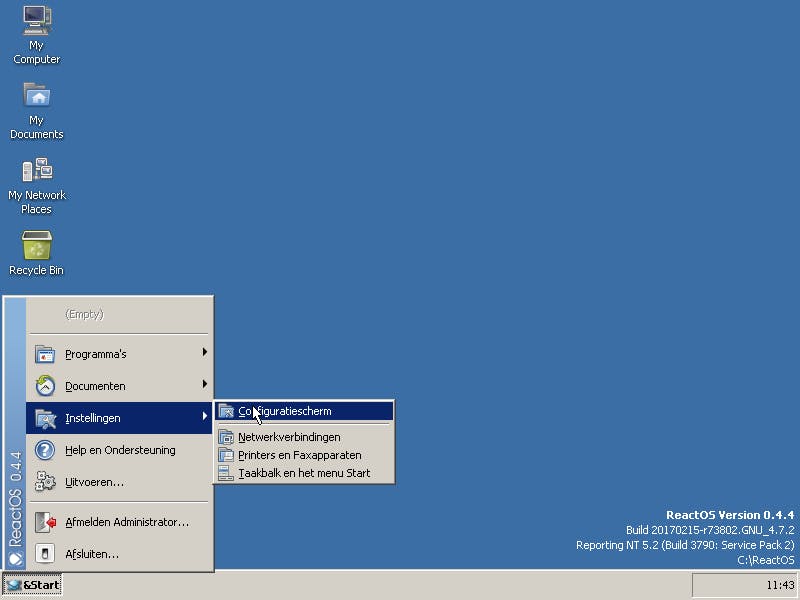 Je hebt nu volwaardige toegang tot ReactOS. Het besturingssysteem gaat op eigen houtje op zoek naar geschikte stuurprogramma’s voor aangesloten hardware. Zodra ReactOS een nieuwe driver ontdekt, verschijnt er automatisch een pop-upvenster. Selecteer de optie Installeer de driver automatisch en bekijk of het lukt om het stuurprogramma direct te installeren. Helaas gaat dat nogal eens mis, waarbij je als alternatief de driver zo nodig handmatig kunt installeren. Gelukkig werkt de belangrijkste randapparatuur probleemloos in ReactOS – denk aan een muis, toetsenbord en speakers. Wanneer je Windows gewend bent, kost het nauwelijks moeite om aan de gebruikersomgeving van ReactOS te wennen. Linksonder gebruik je de startknop om geïnstalleerde programma’s en het Configuratiescherm te openen. Op het bureaublad vind je verder een prullenbak (Recycle Bin) en verkenner (My Computer). Rechtsonder bevinden zich enkele systeempictogrammen voor de toetsenbordindeling, het volumeniveau en de netwerkverbinding. Overigens gebruikt ReactOS de talen Engels en Nederlands door elkaar. Helaas valt daar momenteel niets aan te doen.