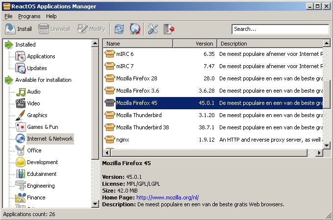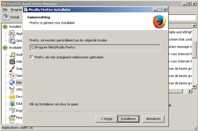 Lang niet alle programma’s zijn in de geïntegreerde softwarecatalogus van ReactOS te vinden. Mis je bepaalde software, dan probeer je de installatie aan de hand van een exe-bestand zelf uit te voeren. Dat lukt jammer genoeg niet altijd, maar heel vaak gaat de installatie wel goed. Probeer het gewoon eens uit! Installeer eerst een browser in ReactOS. Via de softwarecatalogus zijn bijvoorbeeld de programma’s Firefox en Opera beschikbaar. Vervolgens download je vanaf internet het exe-bestand van een programma. Dubbelklik op het exe-bestand om de installatie uit te voeren. Je merkt snel genoeg of het besturingssysteem de software accepteert. Ga naar Start / Programma’s en klik op de naam van de toepassing om de werking te testen.