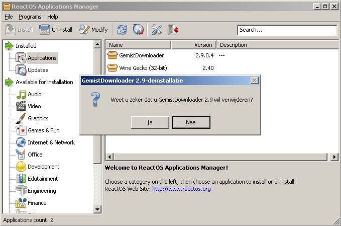 In de praktijk werkt helaas niet ieder programma even goed met ReactOS samen. Software die niet goed functioneert, wil je natuurlijk direct weer verwijderen. Ga hiervoor naar Start / Instellingen / Configuratiescherm en open het onderdeel Add/Remove Programs. Onder Installed klik je vervolgens op Applications. Weet je zeker dat je iets wilt weggooien? Klik op de naam van het programma en kies in de werkbalk voor Uninstall. Afhankelijk van de gekozen software neem je de resterende stappen door om alle programmabestanden definitief te verwijderen.