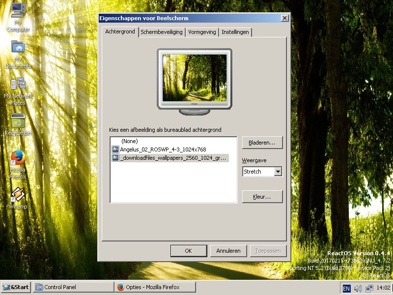 Zoals je merkt, oogt ReactOS in eerste instantie nogal saai. Een andere achtergrond maakt al een heleboel verschil. Gebruik eventueel eerst een browser om wat fraaie afbeeldingen op te slaan. Je kunt hiervoor bijvoorbeeld ook foto’s uit je Facebook-profiel downloaden. Navigeer naar Start / Instellingen / Configuratiescherm en kies voor Beeldscherm. In eerste instantie is er alleen een standaardachtergrond van ReactOS beschikbaar. Die kun je natuurlijk gebruiken, maar het staat je ook vrij om een eigen afbeelding te kiezen. In dat laatste geval zoek je via Bladeren de juiste bestandslocatie op. Heb je afbeeldingen gedownload met Firefox, dan blader je achtereenvolgens naar My Computer / Local Disk (C:) / Documents and Settings / Administrator / Mijn Documenten / Downloads om de beelden te vinden. Dubbelklik op het fotobestand en bevestig met Toepassen. Neem eventueel de andere tabbladen door om onder andere schermbeveiliging en een ander thema in te stellen.