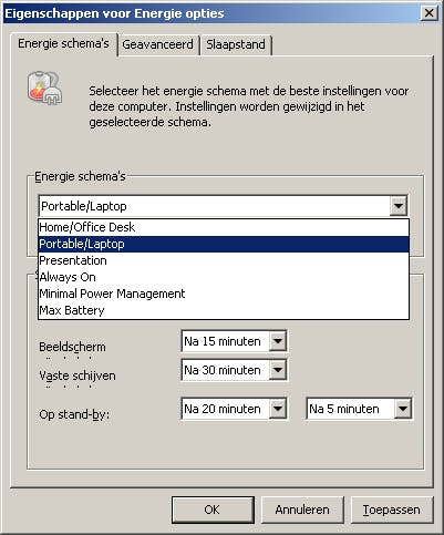 Het is ronduit irritant wanneer het scherm om de haverklap automatisch uitschakelt. Standaard doet ReactOS dat namelijk al na twintig minuten van inactiviteit. Gelukkig pas je de energie-instellingen naar eigen inzicht aan. Open binnen het Configuratiescherm het onderdeel Energie opties. Neem de instellingen onder Settings for power scheme even door. Wil je liever niet dat ReactOS het scherm automatisch uitschakelt, dan selecteer je hier Nooit. Gebruik je een laptop en wil je dat de accu zo lang mogelijk meegaat? In dat geval kun je natuurlijk het beste zoveel mogelijk energie besparen. ReactOS heeft hiervoor een prima energiebeheerschema in huis. Selecteer bij Energie schema’s de optie Portable/Laptop. Het scherm, de schijven en het systeem worden dan na een korte periode van inactiviteit automatisch uitgeschakeld. Maak een keuze en bevestig als laatste met Toepassen.