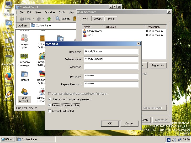 Misschien bevalt ReactOS wel zó goed dat meerdere gezinsleden het willen gebruiken. In dat geval is het zinvol om meerdere gebruikersaccounts aan te maken. Ieder gezinslid beschikt daarmee over een eigen interface. Dubbelklik binnen het Configuratiescherm op User Accounts. Je ziet welke accounts er momenteel beschikbaar zijn. Diegene die het besturingssysteem heeft geïnstalleerd, is normaal gesproken de administrator. Via Add voeg je eenvoudig een extra account toe. Vul de gevraagde gegevens in, zoals de gebruikersnaam en het wachtwoord. Wil je graag dat de gebruiker na het inloggen het standaardwachtwoord wijzigt? Zet dan een vinkje voor User must change the password upon first logon. Wanneer je liever niet hebt dat de gebruiker het wachtwoord wijzigt, vink je de optie User cannot change the password aan. Bevestig met OK.