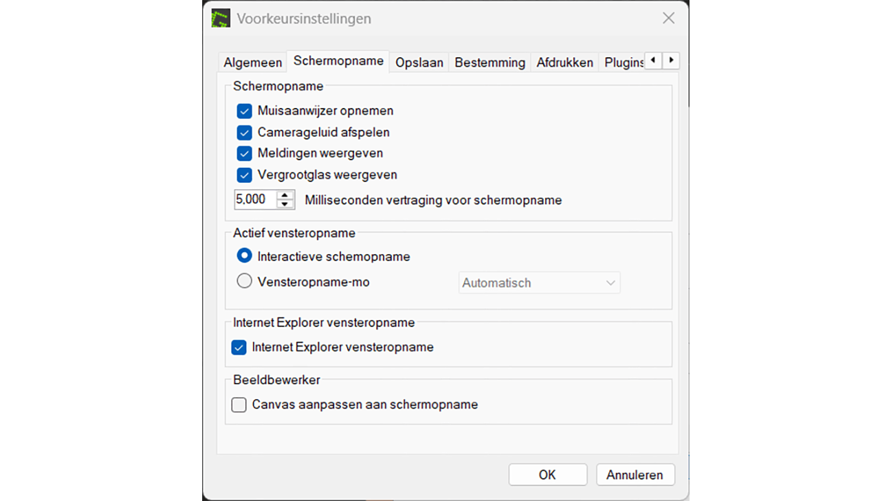Open de Instellingen van Greenshot. In het tabblad Schermopname zie je dat standaard 100 milliseconden vertraging is ingesteld voor een schermopname. Een milliseconde is een duizendste van een seconde. Dat betekent dat het een tiende van een seconde duurt voordat de schermafbeelding daadwerkelijk wordt genomen. Wil je dat er bijvoorbeeld vijf seconden vertraging is, dan stel je dit in op 5000 milliseconden.