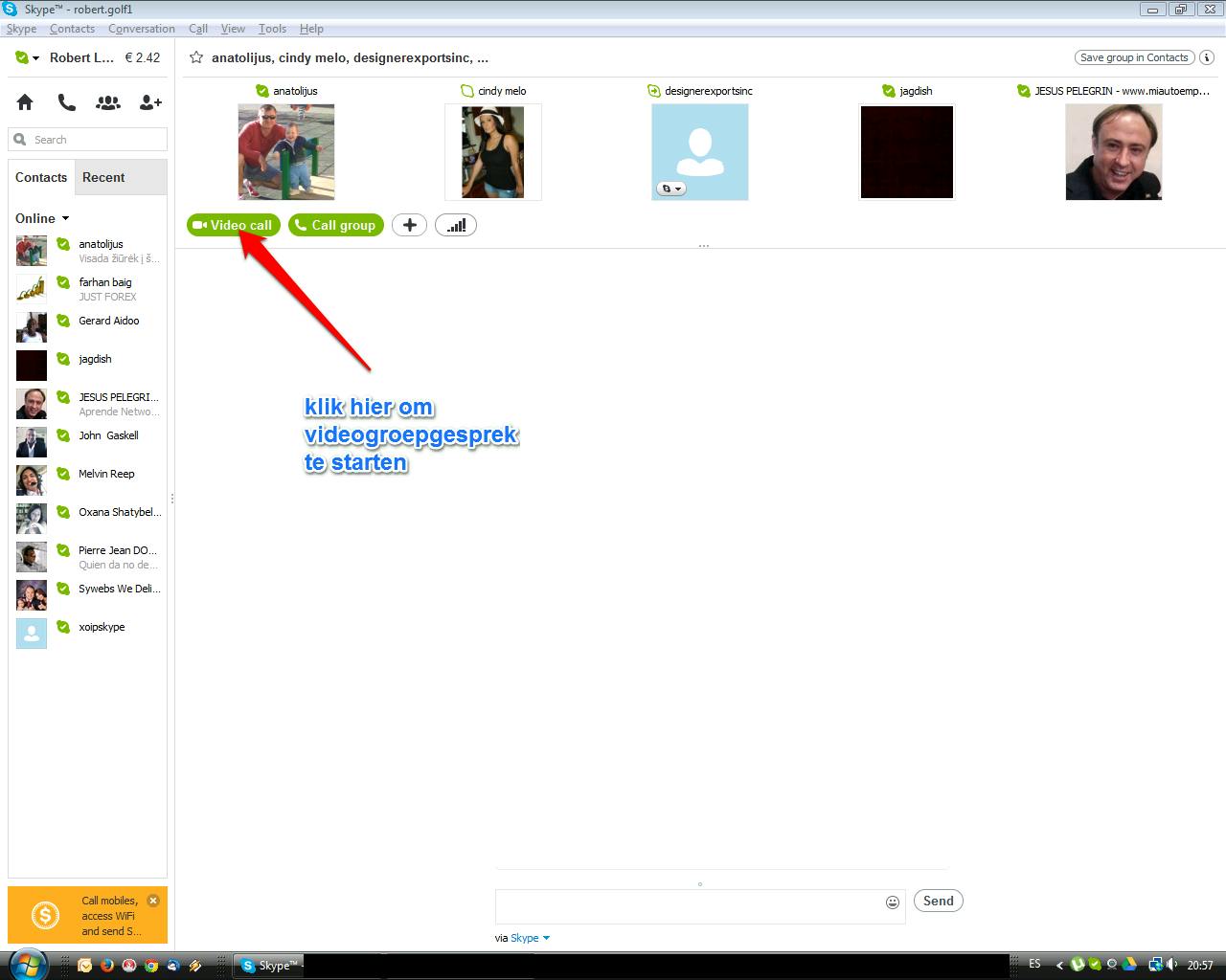 Klik daarna op videogesprek en Skype zal jouw contactpersonen proberen te bereiken. Je hoort de telefoon overgaan totdat één van de geselecteerde contactpersonen je oproep beantwoordt.