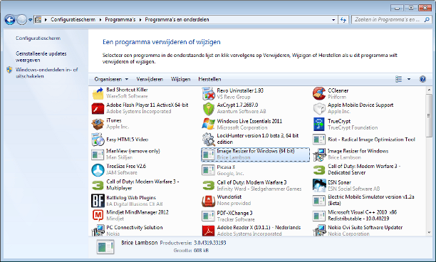 De eenvoudigste manier om een programma van uw computer te verwijderen is via het configuratiescherm. Dit is tevens de meest beperkte weg, dat is niet erg als de procedure vlekkeloos verloopt. Kies in uw configuratiescherm voor Een programma verwijderen om de lijst met aanwezige software op te vragen. Belangrijke kolommen zijn Naam, Uitgever en Geïnstalleerd op. Door op een kolom te klikken, wordt de lijst met geïnstalleerde software gesorteerd. Sorteren op naam of installatiedatum is bijvoorbeeld handig als u snel een bepaald programma zoekt of wanneer u wilt weten wat u vorige week geïnstalleerd hebt. Door een programma aan te klikken, krijgt u boven in beeld maximaal drie knoppen te zien: Verwijderen, Wijzigen en Herstellen. Door op een programma te dubbelklikken, wordt de de-installatieprocedure gestart. Deze procedure is afkomstig van de makers van het programma. Windows geeft u de mogelijkheid om één programma gelijktijdig te de-installeren.