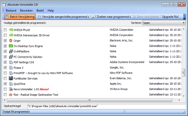 Absolute Uninstaller zet de de-installatieprocedure van meerdere programma's gelijktijdig in gang via Batch verwijdering.