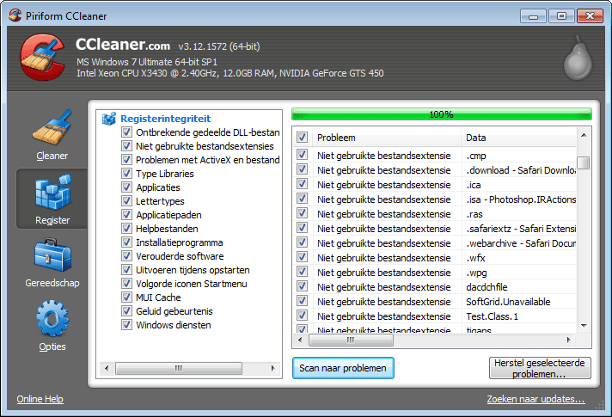 Er zijn op internet allerlei programma's te vinden om het Windows-register op te schonen en bijvoorbeeld te ontdoen van foute vermeldingen na een gebrekkige software de-installatie. Veel geautomatiseerde schoonmaakprogramma's die direct het Windows-register aanspreken doen echter meer kwaad dan goed. Als u toch iets wilt proberen, raden we CCleaner aan, maar ook dit is niet zonder risico. Veel mensen zijn bekend met de schoonmaakfuncties van CCleaner. Achter de knop Register vindt u de optie Scan naar problemen. Hiermee kunt u zoeken en naar onder andere foutieve verwijzingen en deze laten oplossen. Vaak zijn meerdere scans nodig om alle fouten eruit te krijgen. Voordat CCleaner aanpassingen doorvoert, wordt u in de gelegenheid gesteld om een back-up maken van de wijzigingen. Dit is zeker aan te raden!