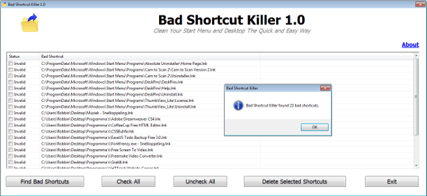 Bad Shortcut Killer zoekt en vindt dode snelkoppelingen waarna u ze eenvoudig kunt opschonen.