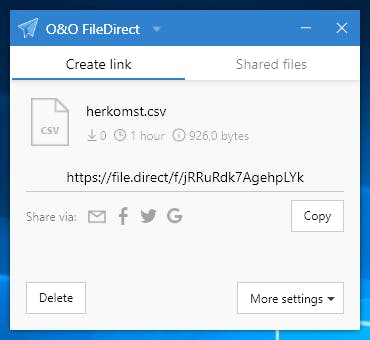 Het eerste tabblad heeft de naam Create link. Wanneer je een bestand naar dit tabblad sleept, verschijnt er een link die je kunt doorsturen naar degene met wie je het bestand wilt delen. Om het je makkelijk te maken, zijn er knoppen naar e-mail, Facebook, Twitter en Google Plus en er is een knop om de link rechtstreeks naar het klembord te kopiëren. De bestemmeling ontvangt een downloadlink en haalt het bestand binnen via het WebRTC-protocol. Dat is een opensourceprotocol om bestanden via de browser uit te wisselen zonder dat extra plug-ins of software van derden nodig zijn. Wanneer je meerdere bestanden tegelijk in het Create link-tabblad sleept, maakt het programma er één zipbestand van. In het tabblad Share Files volg je wat je deelt en hoe vaak ieder bestand is gedownload. Dit is ook de plaats om de downloadlink te verwijderen.