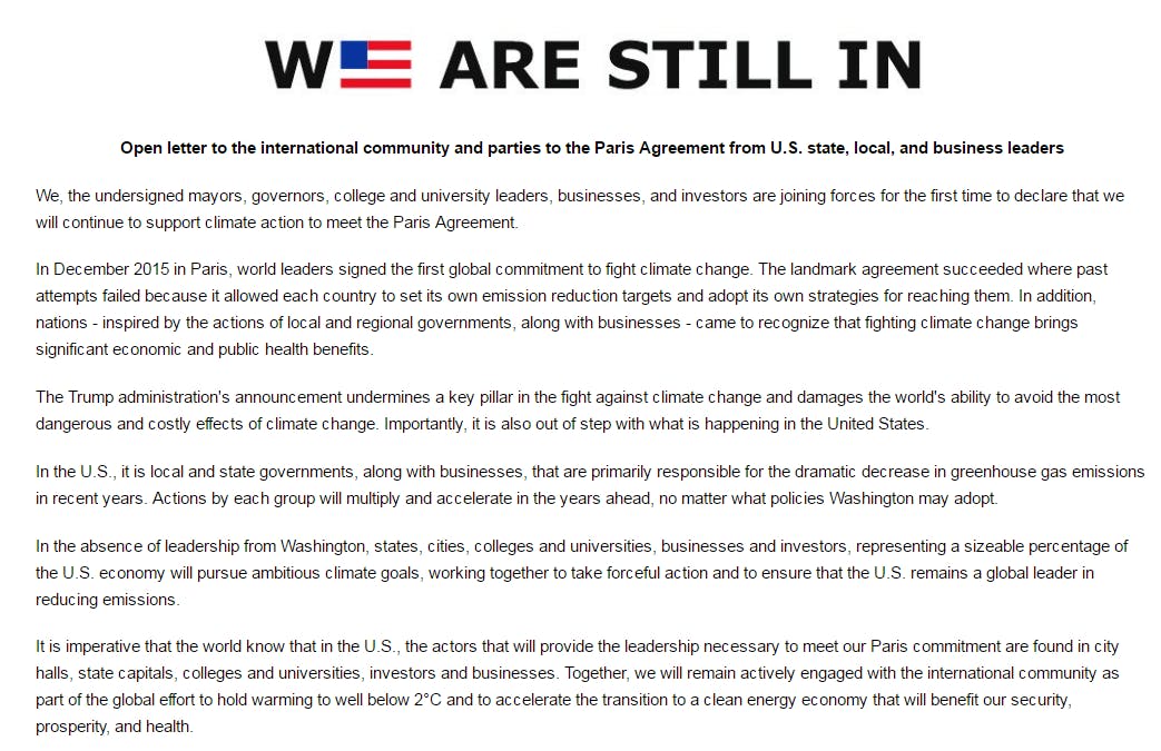 Bijna alle grote Amerikaanse techbedrijven hebben zich in een open brief aan de Amerikaanse staat achter het klimaatakkoord van Parijs geschaard. Met de campagne We Are Still In willen de bedrijven duidelijk maken dat zij de afspraken die destijds gemaakt zijn zullen naleven, ook nu de Verenigde Staten uit het akkoord stappen.