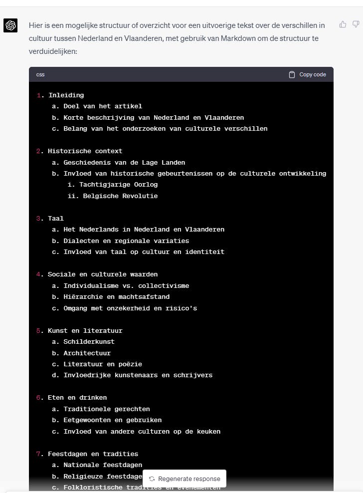 Als je zelf al enige kennis hebt over het onderwerp, maar nog op zoek bent naar een mogelijke tekststructuur, dan kan de bot je helpen om uit deze impasse te komen. Zo heeft de volgende prompt bijvoorbeeld al uitstekende ideeën opgeleverd, inclusief een inleiding, enkele paragrafen en een conclusie: “Geef een mogelijke structuur of overzicht van een uitvoerige tekst die ik wil schrijven over de verschillen in cultuur tussen Nederland en Vlaanderen, bedoeld voor een cultureel tijdschrift.” Je kunt deze deelontwerpen vervolgens ook verder laten uitdiepen door de bot.