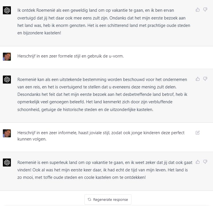 Je kunt ook je tekst laten herschrijven voor een ander doelpubliek en dus met een andere stijl en woordenschat. Dit kan met een prompt als deze: “Herschrijf de volgende tekst in een zeer informele, haast joviale stijl, zodat ook jonge kinderen deze leuk vinden en kunnen begrijpen.” Het omgekeerde kan natuurlijk ook: “Je bent een ervaren geschiedkundige. Herschrijf de volgende tekst in een zeer formele stijl, bedoeld voor een publiek dat in deze materie is gespecialiseerd.” Je zult vaak versteld staan van het resultaat.