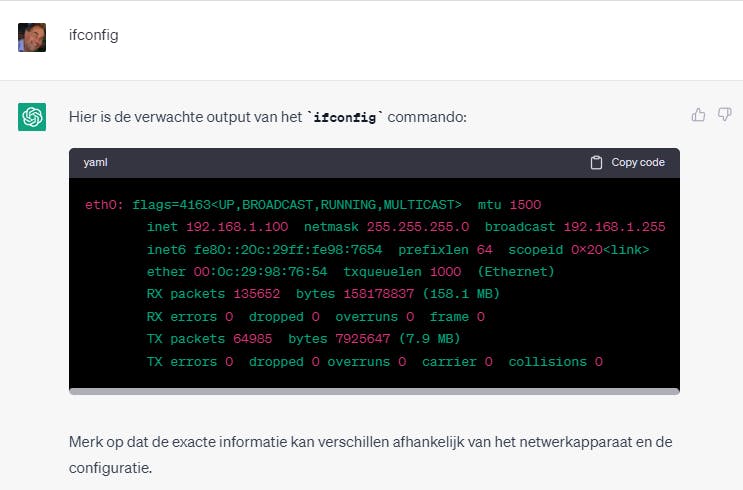 Ook leuk is dat je de bot in een of andere computerrol kunt stoppen, bijvoorbeeld om een terminal van PowerShell of Linux te simuleren, waardoor je commando’s vanaf de virtuele terminal kunt uitvoeren. Ook dit vereist de nodige instructies in je prompt, bijvoorbeeld: “Je bent een Linux-terminal. Ik zal commando’s invoeren en ik wil dat je antwoordt met wat op zo’n terminal verschijnt. Geef geen andere uitleg, behalve wanneer ik iets vraag tussen vierkante haakjes, als volgt [mijn vraag].” Vervolgens kun je allerlei commando’s uitvoeren en zal de bot typische terminal-commando’s imiteren.