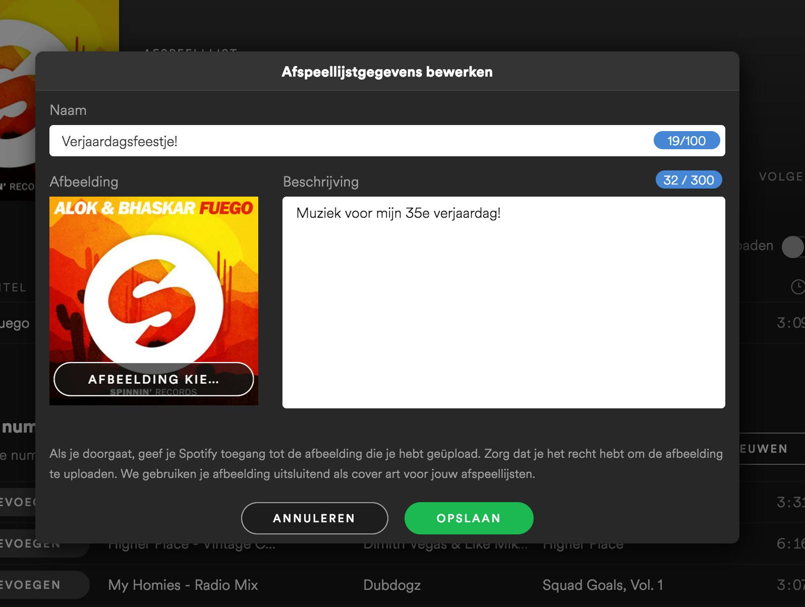 Afspeellijsten zijn een belangrijk onderdeel van Spotify. Een afspeellijst kun je zien als een compilatiealbum: je voegt muziek toe aan een lijst die je vervolgens in één stuk kunt afspelen. Zo kun je bijvoorbeeld leuke muziek selecteren voor je verjaardagsfeest en deze afspeellijst tijdens het feest afspelen. Een afspeellijst kan ook samengesteld zijn door iemand anders: door een andere Spotify-gebruiker of door de redactie van Spotify zelf. Er zijn openbare lijsten en privé-afspeellijsten. Als je een afspeellijst voor jezelf aanmaakt, is deze standaard privé. Om muziek aan een afspeellijst toe te voegen, klik je op de drie stipjes achter een nummer of album en kies je voor Aan afspeellijst toevoegen. Als je al eens afspeellijsten hebt aangemaakt, klik je op de naam om de muziek eraan toe te voegen. Is het je eerste lijst, dan kies je voor Nieuwe afspeellijst. De aangemaakte lijst vind je links terug onder Afspeellijsten. Om de naam van de lijst te veranderen, klik je met de rechtermuisknop op de naam en kies je voor Gegevens bewerken. Geef een naam op en vul eventueel wat informatie in onder Beschrijving. Sluit af door op Opslaan te klikken.