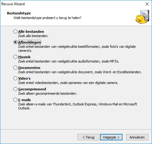 Doorloop de wizard door eenvoudige vragen te beantwoorden. Kies welk type bestand je kwijt bent, bijvoorbeeld Afbeeldingen. Geef aan waar de afbeeldingen (zouden moeten) staan. Bekende locaties vind je in de lijst, zoals Op mijn mediakaart, In mijn documenten of In de prullenbak. Met de optie Een specifieke locatie kun je zelf aangeven waar Recuva moet zoeken, bijvoorbeeld op je D-schijf.