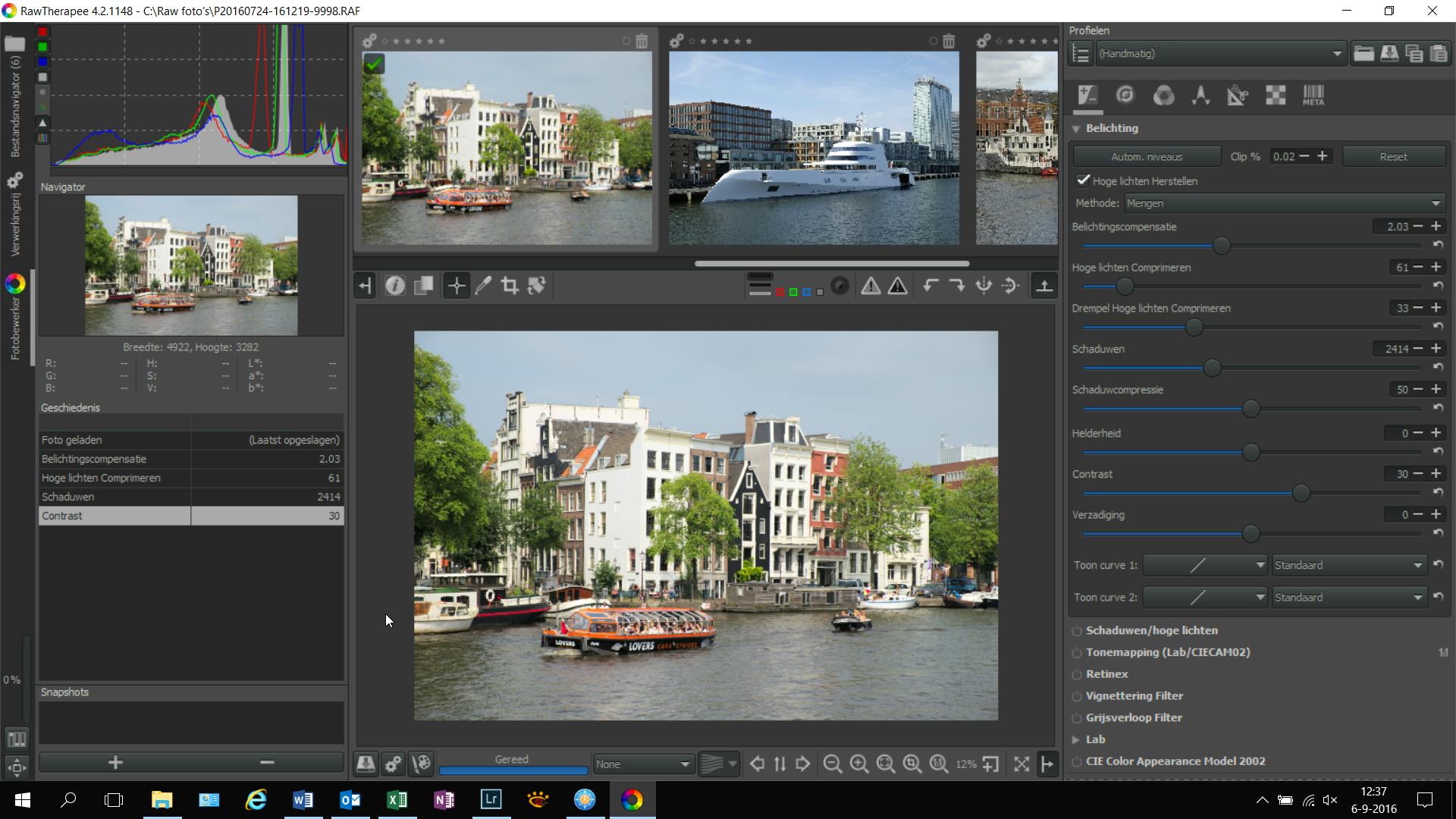We beginnen in Raw Therapee op tabblad Belichting. Met Belichtingscompensatie maak je een foto lichter of donkerder. Net zoals je dit ook tijdens het maken van een foto op de camera doet. Je past er de volledige foto mee aan, waardoor de kans bestaat dat sommige delen te licht of te donker worden. Vandaar dat je de lichte en donkere gebieden ook apart kunt inregelen. Met Hoge lichten comprimeren verminder je de felheid van alleen de lichtste gebieden. Zet dan meteen ook een vinkje bij Hoge lichte Herstellen. Met Schaduwen maak je de donkere delen van de foto lichter of donkerder, zonder dat de lichte delen meegaan. Aanvullend gebruik je Schaduwcompressie om het effect nog wat te finetunen. Nu de lichte en donkere delen beter in balans zijn, voeg je met Contrast eventueel wat extra pit toe aan de foto. Veel werk? Je kunt het programma deze stappen ook automatisch laten uitvoeren via een klik op de knop Automatische niveaus. Dan hoef je de boel daarna alleen nog even te tweaken. Dit tabblad bevat enorm veel gereedschappen om de belichting tot in de puntjes te verzorgen. Experimenteer er gerust mee zodra je ervaring hebt opgedaan met de hier genoemde basisgereedschappen.