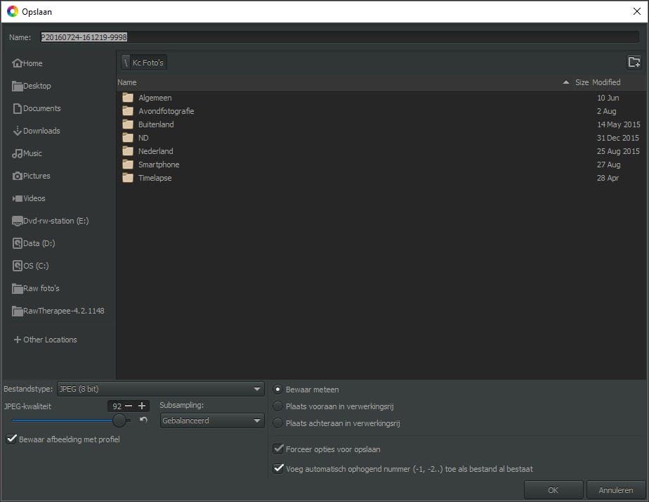 Na bewerking van een raw-bestand met Raw Therapee ben je nog niet klaar. Er is namelijk nog geen echte foto die je kunt laten zien. Die moet je eerst genereren. Dat kan op meerdere manieren. Bijvoorbeeld meteen zodra je klaar bent met een raw-bestand. Klik linksonder de voorbeeldweergave op Bewaar huidige foto. Wijs een map aan, kies het bestandstype (doorgaans jpeg) en klik op OK. De foto wordt meteen gegenereerd, waardoor het programma langzamer wordt. Wil je liever vlot doorwerken? Dan kun je beter alle raw-bestanden in een wachtrij verzamelen. Om ze vervolgens allemaal tegelijk te verwerken zodra jij een kopje koffie drinkt of een broodje eet. Klik hiertoe links onder de voorbeeldweergave op Plaats huidige foto in verwerkingsrij. Klaar met bewerken? Klik in de linker kantlijn op het tab Verwerkingsrij, wijs een map aan, kies het bestandstype en de fotokwaliteit en klik op de knop Start verwerking van bestanden in verwerkingsrij.