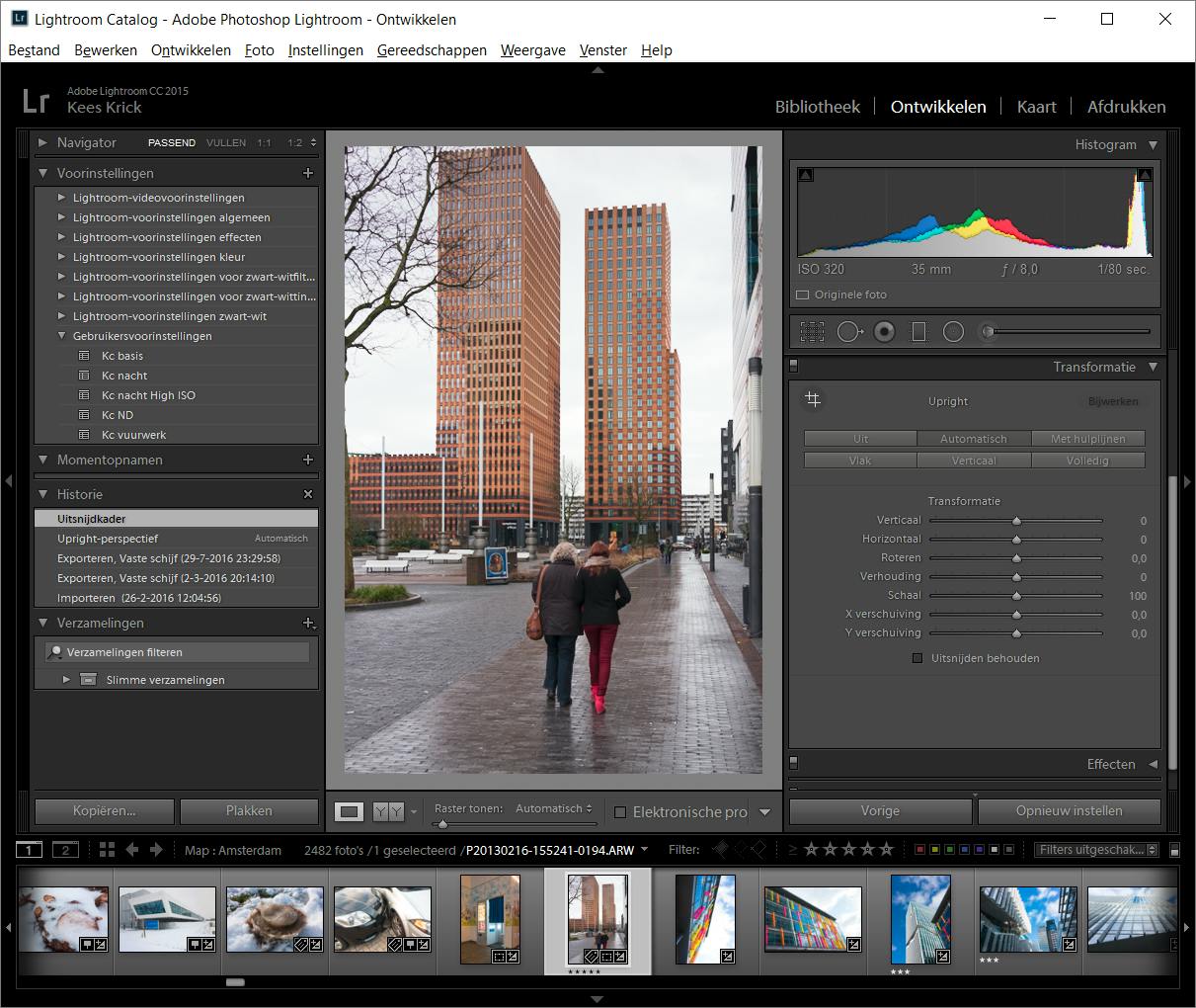 Lightroom herkent de camera’s en lenzen van een groot aantal fabrikanten, zodat het allerlei vervormingen volledig automatisch kan verhelpen. Het is verstandig dit tijdens het bewerken als eerste te doen, omdat het invloed heeft op bijvoorbeeld de belichting en de kleuren. In de Ontwikkelmodule blader je hiertoe omlaag naar het onderdeel Lenscorrecties. Kies voor het tabje Profiel en vink Correcties profiel inschakelen aan. Als het goed is wordt het merk en model van zowel camera als lens automatisch getoond en vinden allerlei correcties plaats. Ook perspectivische vervorming lost Lightroom automatisch op. Denk aan een gebouw dat scheef staat omdat je de camera scheef of schuin omhoog hield. Klik in het onderdeel Transformaties bij Upright op Automatisch en meestal staat alles weer netjes in het lood. Zo niet, kun je altijd nog handmatige correcties aanbrengen. Ook handig is dat je kunt retoucheren. Klik rechts bovenin onder het histogram op het pictogram Vlekken verwijderen en klik of schilder over lelijke plekjes heen, waarna Lightroom ze repareert met omliggend beeldmateriaal.