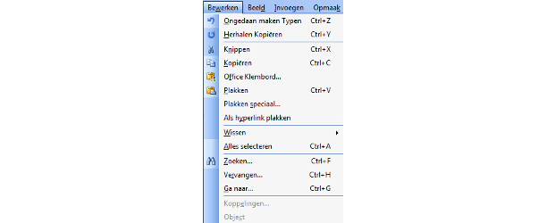 De opties Kopiëren, Knippen en Plakken zijn ook op te roepen met een toetscombinatie.