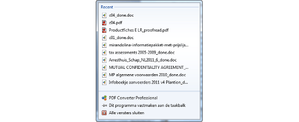 De taakbalk speelt een prominentere rol in Windows 7, nu u programma's daarop kunt vastpinnen (enigszins vergelijkbaar met de Dock van Mac OS X). Dit betekent dat er ook meer taakbalkspecifieke sneltoetsen aanwezig zijn (naast de sneltoetsen die we reeds bespoken hebben in tip 1, 2 en 3 uiteraard). Wanneer u bijvoorbeeld drukt op de Windows-toets in combinatie met één van de cijfers 1 tot en met 9 op het toetsenbord, dan opent u een van de programma's die u hebt vastgepind op de taakbalk (waarbij 1 uiteraard de eerste opent, 2 de tweede, enzovoort). Hoger dan 9 kunt u helaas niet gaan, drukt u namelijk de Windows-toets in en vervolgens 11, dan opent u eerst het bewuste programma en minimaliseert u het direct. Houdt u bij deze toetscombinatie ook nog de Shift-toets ingedrukt, dan opent u een nieuw venster van het betreffende programma (zo kunt u dus een nieuw venster van de Windows Verkenner openen wanneer u al een venster van de Windows Verkenner open hebt). De toetscombinatie Ctrl+Windows-toets+cijfer (1 tot en met 9), stelt u in staat door open vensters heen te bladeren (ongeveer zoals multitasking Alt+Tab, maar dan met meer controle). Vervangt u de Ctrl door de Alt in deze toetscombinatie, dan opent u de Jump List (lijst met opties) van de applicatie die bij het betreffende nummer hoort.