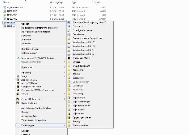 Door met de Shift-toets ingedrukt te rechtsklikken op een bestand of map, verschijnen er meer opties in het menu Kopiëren naar.